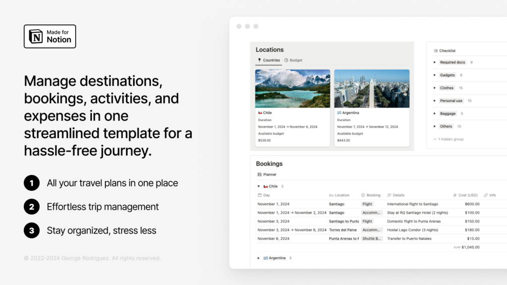 Effortlessly organize your trips with our all-in-one Travel Planner Notion template. Manage your destinations, reservations, activities, and budget in one place. Simply add your travel details, track expenses, and watch everything sync automatically for a smooth and stress-free experience.